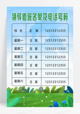 蓝色简约领导值班名单及电话号码值班表制度模板值班表海报
