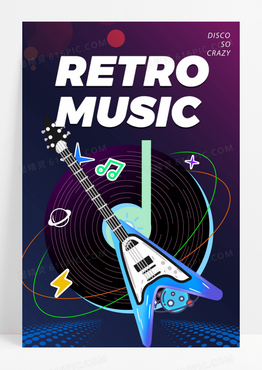 蓝色吉他音波扩音器插画创意音乐闪亮海报