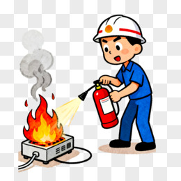 卡通插画消防员手拿灭火器来给电器灭火场景