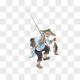 水墨风渔夫穿着斗笠垂钓免抠素材