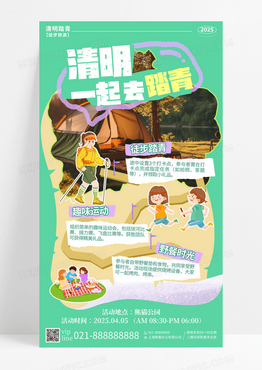 绿色简约地图插画清明一起去踏青手机宣传海报