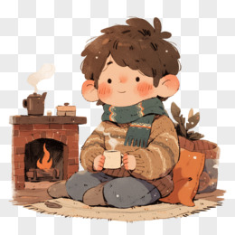 插画男孩拿着热水在壁炉旁取暖免抠元素