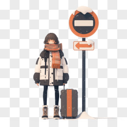 3D插画女孩拉着行李箱站着路牌旁免抠元素