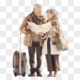 3D插画一对老年夫妇拉着行李箱看地图抠元素