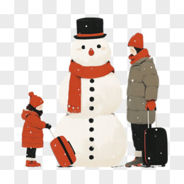 插画一对母亲和小朋友拉着行李箱站着雪人旁免抠元素