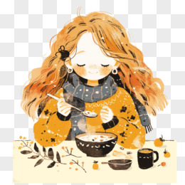 立冬之手绘卡通女孩拿着勺子吃汤圆