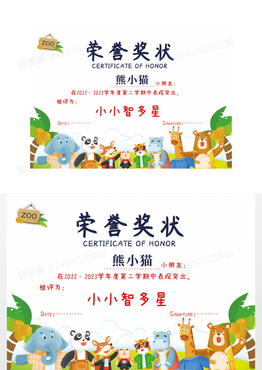 卡通温馨动物插画幼儿园荣誉证书奖状