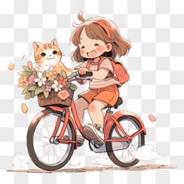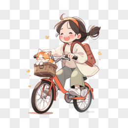 小女孩骑自行车带着猫卡通插画
