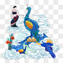 手绘孔雀和少女创意插画素材