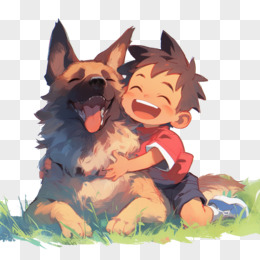 卡通风宠物小男孩抱着德牧在草地上免抠元素