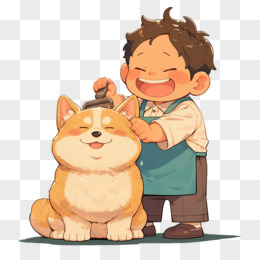 卡通风宠物男子给柴犬梳毛免抠元素