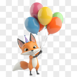 3D插画狐狸戴着生日帽拿着彩色气球免抠元素
