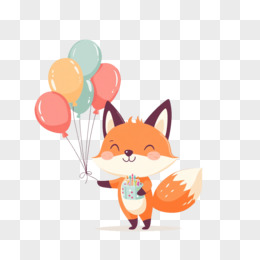 插画狐狸拿着生日蛋糕和彩色气球免抠元素
