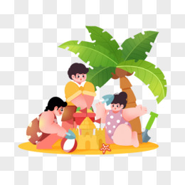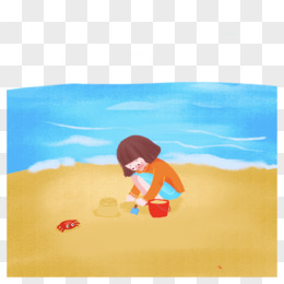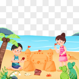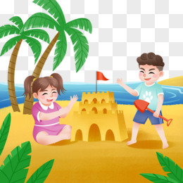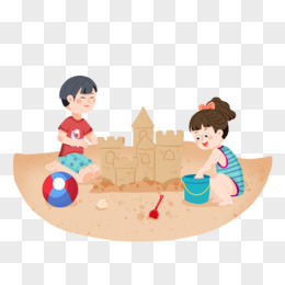 手绘小伙伴沙滩堆沙堡玩沙子素材