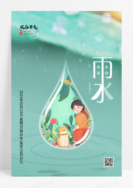 雨水之创意手绘卡通女孩在幼苗下躲雨