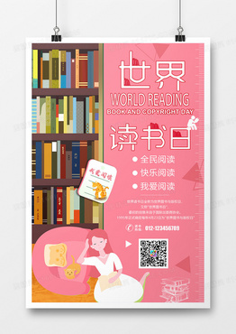 粉色卡通世界读书日教育宣传海报