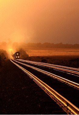 缓缓行驶而来的火车傍晚晚霞