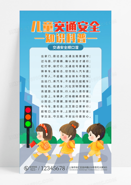 蓝色简约卡通插画风儿童交通安全知识科普ui手机海报