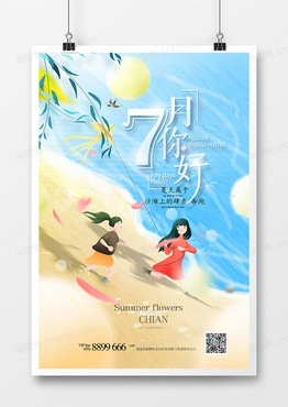 夏天之手绘可爱卡通的女孩在沙滩上吃西瓜