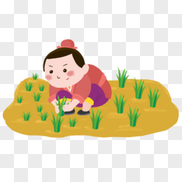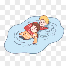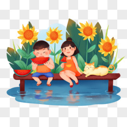 手绘卡通立夏男孩女孩在湖边吃瓜场景免抠素材