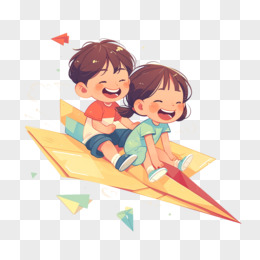 卡通手绘可爱女孩男孩坐纸飞机免抠元素