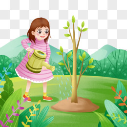 手绘插画风植树小孩浇水免抠元素