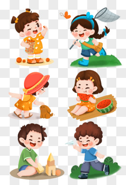 手绘卡通小伙伴们在海边捡贝壳免抠素材