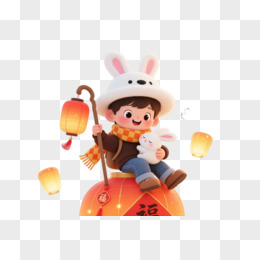 萌兔帽男孩坐灯笼抱小白兔迎春
