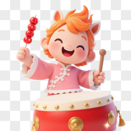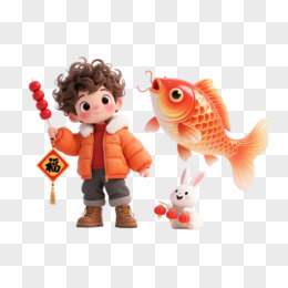 欢笑男孩携金鲤糖葫芦与福字兔迎春