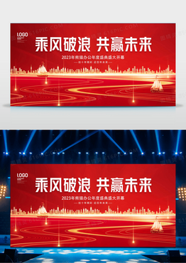 乘风破浪共赢未来大气红金城市剪影企业年会舞台背景模板