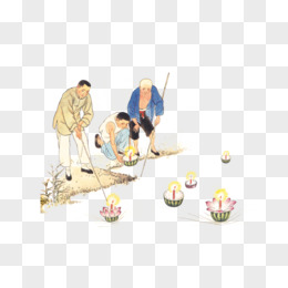 卡通风中元小女孩在河边放荷花灯免抠元素