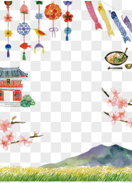 唯美精美卡通清新草地背景小路花朵房子彩虹树
