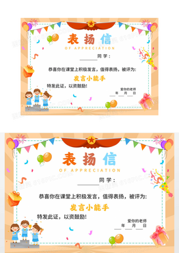 黄色简约插画发言小能手表扬信展板
