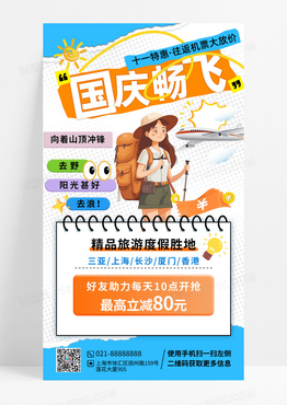 蓝色剪纸风国庆畅飞优惠活动营销海报