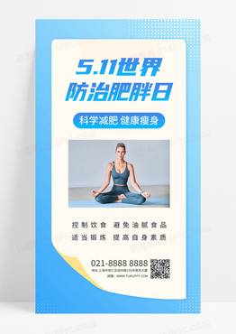 浅蓝色简约世界防治肥胖日女人瑜伽海报宣传海报素材