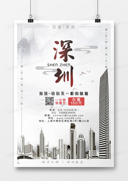 白色卡通线条建筑现代都市风景简约风深圳游海报