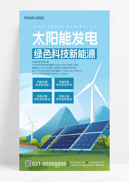 蓝色卡通简约太阳能发电绿色科技新能源宣传手机海报