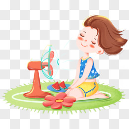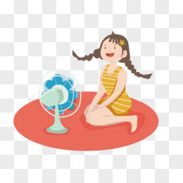手绘卡通夏季吹风扇女孩小场景元素