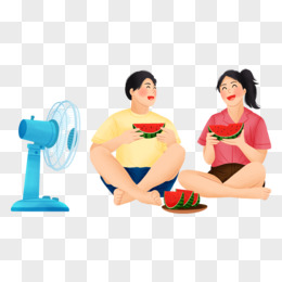 手绘插画风男生女生一起吹风扇吃西瓜元素