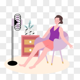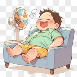 卡通小男孩坐在沙发上吹风扇解暑免抠元素