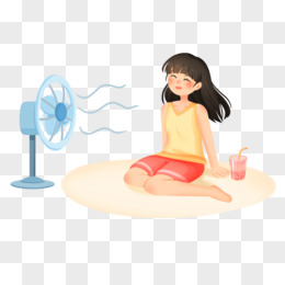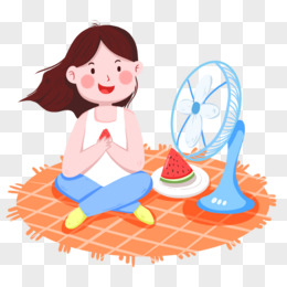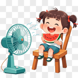 手绘卡通女孩吹风扇吃西瓜免抠素材
