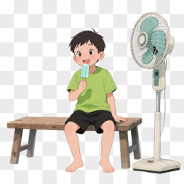 卡通小男孩拿着冰棍坐在椅子上吹风扇解暑免抠元素