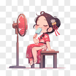 卡通穿旗袍的女孩拿着冰棍吹风扇解暑免抠元素