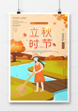 立秋秋天来了大树创意植物手绘矢量卡通枫叶小女孩秋季橙色