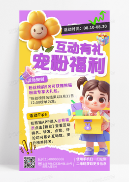 宠粉福利互动有礼花3D人物黄紫色简约海报