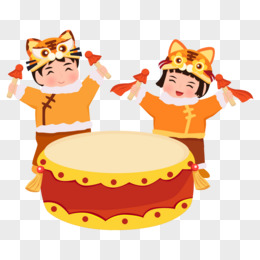 卡通手绘过年戴虎头帽的福娃击鼓场景素材