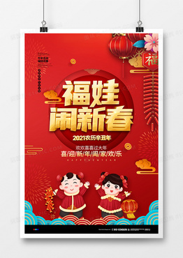 红色喜庆2021福娃闹新春宣传海报设计