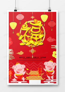 红色中国风2019福猪送福海报