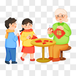 手绘卡通老奶奶教孙子孙女剪花窗免抠素材