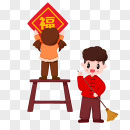 手绘男孩女孩张灯结彩打扫卫生免抠元素